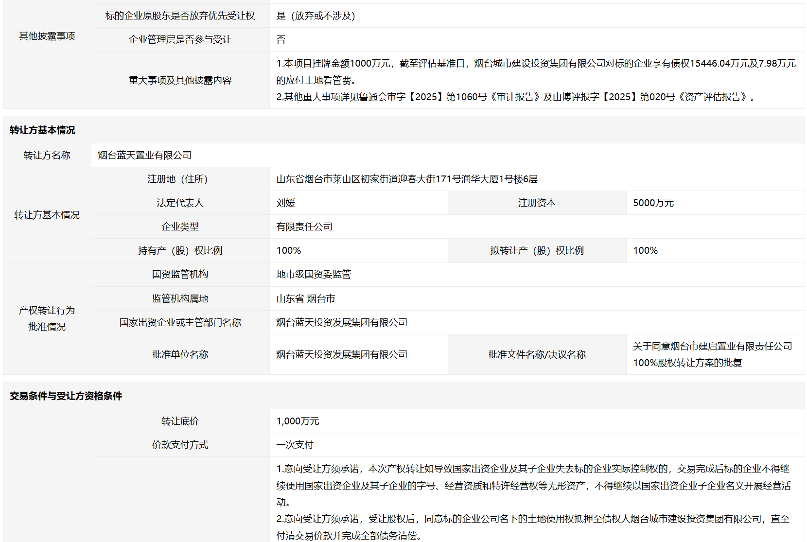 煙臺市建啟置業(yè)有限責任公司100%國有股權