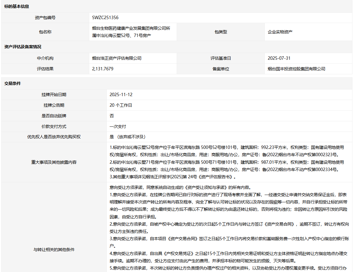 煙臺(tái)生物醫(yī)藥健康產(chǎn)業(yè)發(fā)展集團(tuán)有限公司所屬中冶沁海云墅52號(hào)、71號(hào)房產(chǎn)