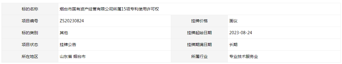 煙臺(tái)市國(guó)有資產(chǎn)經(jīng)營(yíng)有限公司所屬15項(xiàng)專利使用許可權(quán)